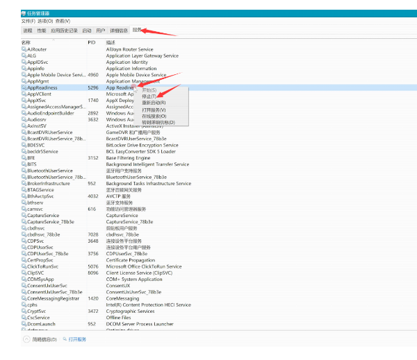 2.单击“服务”选项卡,选择“应用就绪”,右键单击并选择“停止”。